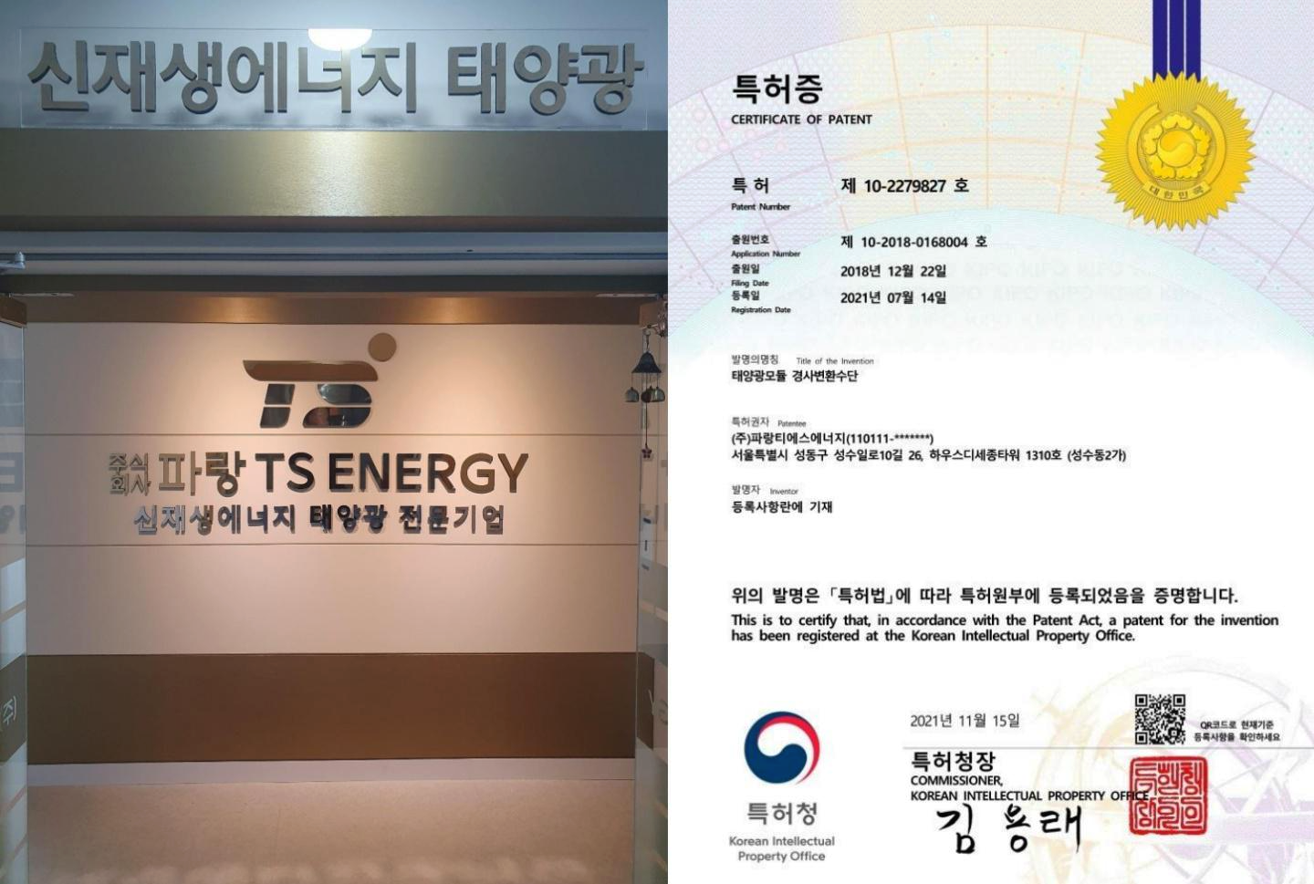 저희 파랑티에스에너지에서 특허를 취득했습니다.