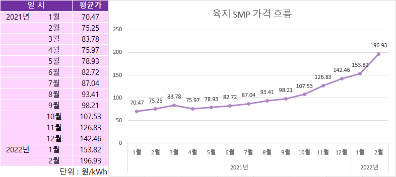 태양광 SMP 가격은 2021년 1월에 1kW당 평균 70.47원을 기록한 것에 비해 지난 2022년 2월에는 196.93원을 기록했습니다. 작년 1월에 비해 2.8배 오른 수치이며 2013년 10월에 기록했던 202.05원 이후 8년 4개월만에 최고치를 기록하였습니다.