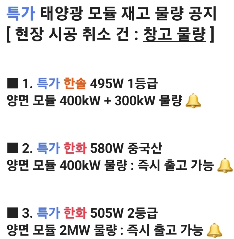 특가 태양광 모듈 재고 물량 공지