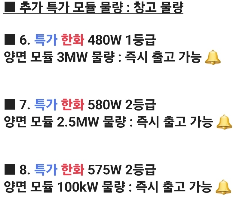 윗 특가 태양광 모듈 중 필요하신 물량 있으시면 언제든지 연락 부탁드리겠습니다.