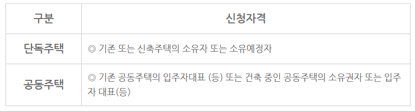 ② 신축주택의 경우 신청시점부터 에너지원별 설치완료 기간 내 설치가 가능한 주택에 한하여 지원됩니다. (설치기한 내 미설치 시 사업취소 사유 해당)