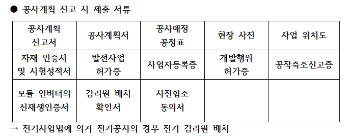 발전사업에 대한 승인이 나고 개발행위 허가까지 모두 마무리가 되면 공사계획 신고를 하시게 됩니다. 이때 모든 절차를 밟은 후에 진행하기 보다는 처음 태양광 발전사업 허가를 진행할 때 같이 준비하시면 시간을 절약할 수 있습니다. 공사계획 신고에 필요한 서류가 모두 준비된 후 태양광 발전소가 들어설 지역의 발전사업 허가 담당자를 찾아가 관련 서류를 제출하시면 된답니다.