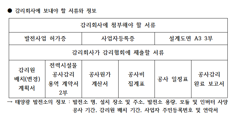 전기사업을 하기 위해서는 전기공사를 감리하는 감리원을 배치해야 합니다. 감리회사에 감리를 요청하면 필요한 서류를 발전사업자에게 보내달라고 요구하게 되는데요. 이에 서류를 모두 준비하고 감리회사로 보내면 앞에서 정했던 공사 기간에 맞춰 감리원을 배치하고 이에 대한 확인서를 받을 수 있습니다. 감리회사는 해당 태양광 발전소의 여러 가지 정보 및 필요한 서류들을 모아서 감리협회에 제출하게 되는데 이때 필요한 서류들도 같이 첨부하여 감리회사에 보내면 처리를 대행해줍니다.