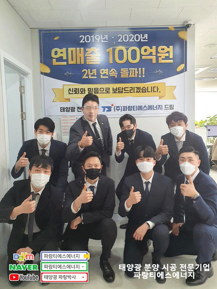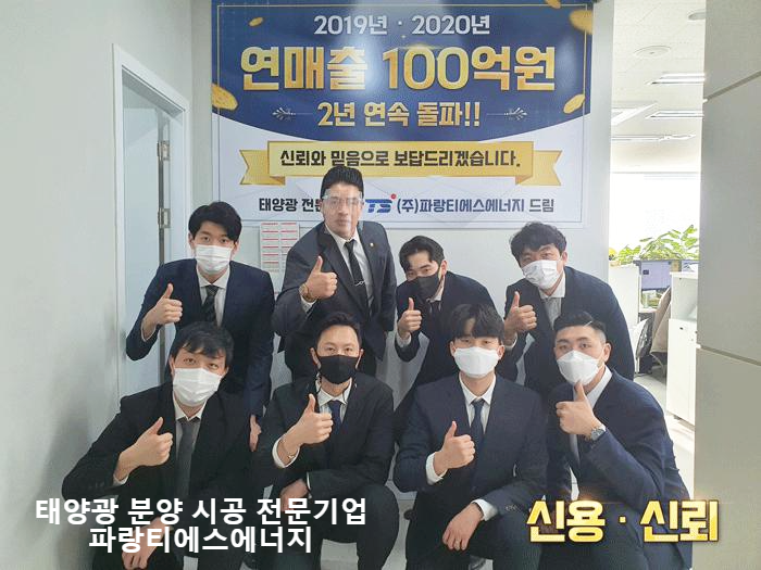 태양광 분야에서 다양한 활동을 하고 있는 파랑티에스에너지가 18년 2월 22일 법인 창립 이래로 2년 근속 연매출 117억을 돌파했다는 소식입니다. 파랑티에스에너지는 214개의 법인사업자 및 개인사업자들과의 거래실적을 보증하며 2019년에는 매출 143억, 2020년 작년은 매출 117억을 달성하며 2년 연속 매출 117억을 거두는 쾌거를 이루었습니다.